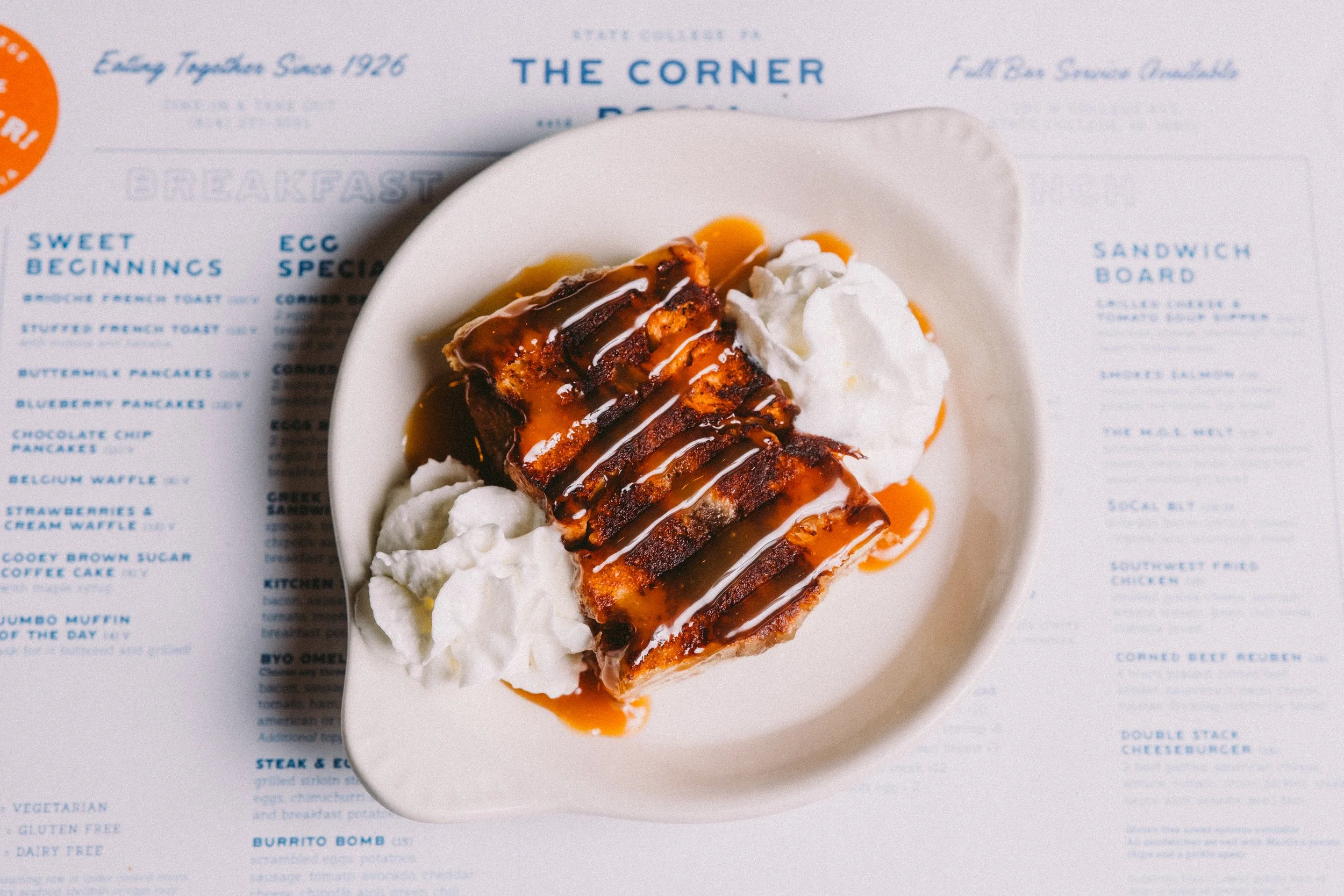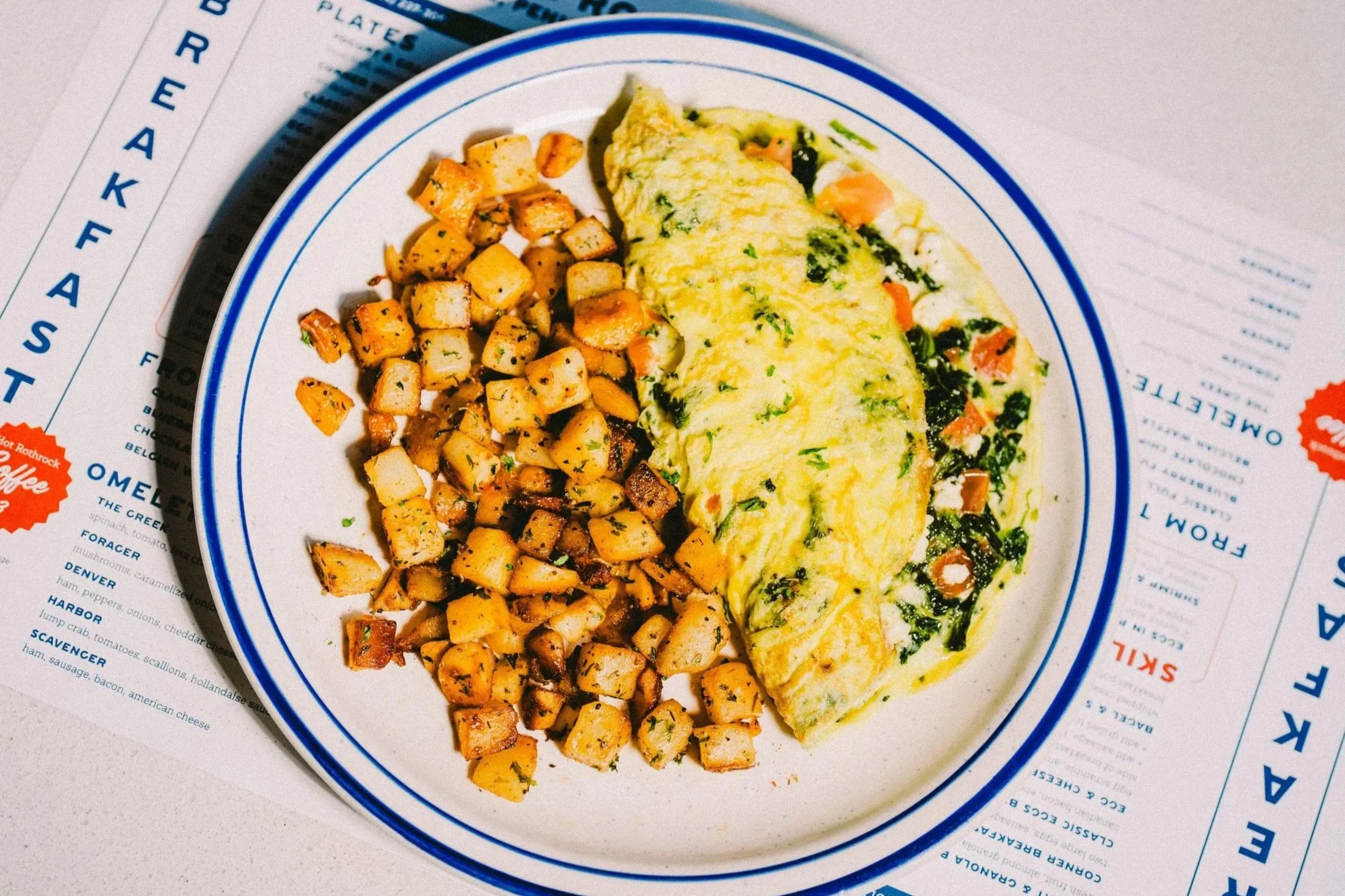 Choose 3 toppings: bacon, sausage, broccoli, spinach, tomato, ham, mushrooms, cheddar jack cheese, american, or swiss, breakfast potatoes, toast