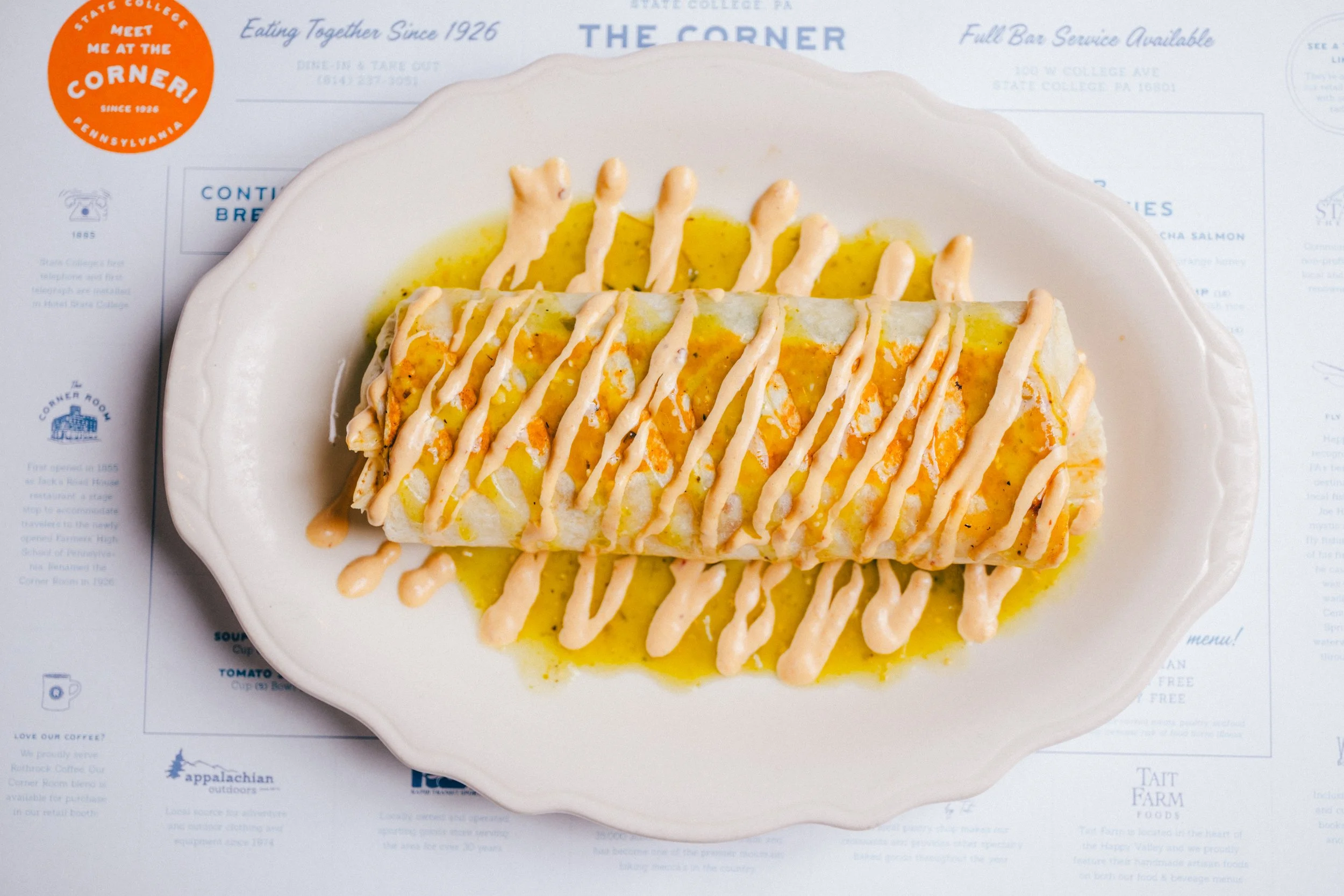 scrambled eggs, potatoes, sausage, tomato, avocado, cheddar cheese, sriracha aioli, green chili verde sauce