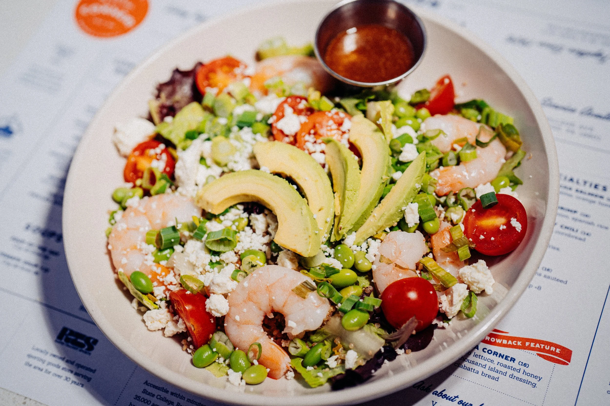 mixed lettuce, quinoa, edamame, tomatoes, avocado, scallions, feta cheese, chilled shrimp, sesame ginger dressing